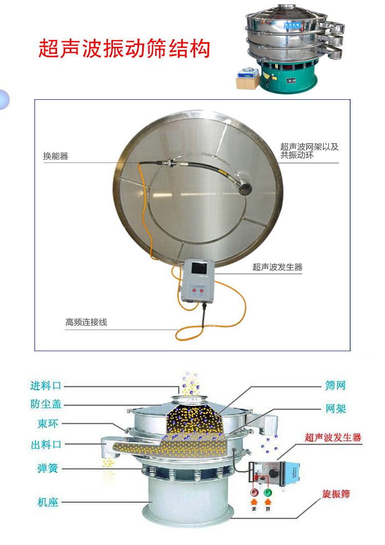 超聲波振動篩與旋振篩外形上大致相似,超聲波振動篩是在旋振篩基礎(chǔ)上加裝了超聲波發(fā)生裝置(超聲波電源、超聲波換能器)。