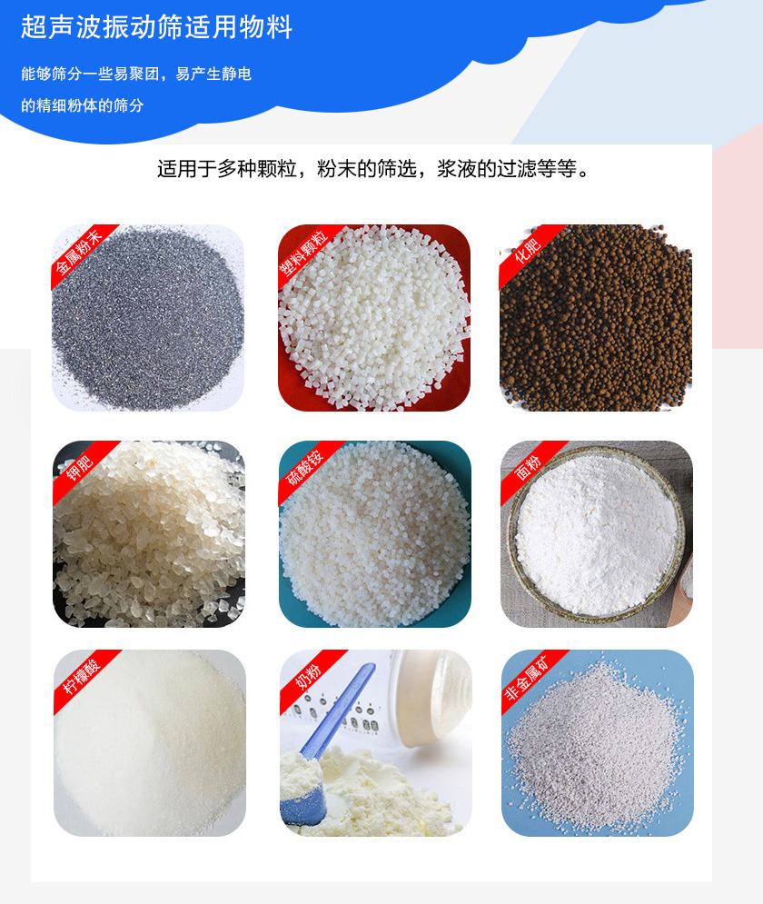 超聲波振動篩是在旋振篩的基礎(chǔ)上所衍生出來的篩分設(shè)備,能夠篩分一些易聚團,易產(chǎn)生靜電的精細粉體的篩分。