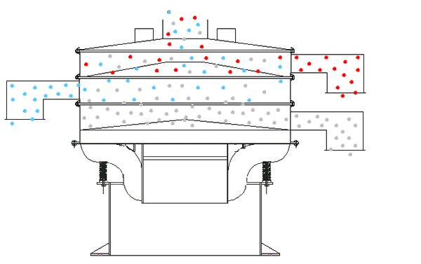 旋振篩是由直立式電機作激振源,電機上、下兩端安裝有偏心重錘,將電機的旋轉(zhuǎn)運動轉(zhuǎn)變?yōu)樗?、垂直、傾斜的三次元運動,再把這個運動傳遞給篩面。調(diào)節(jié)上、下兩端的相位角,可以改變物料在篩面上的運動軌跡。