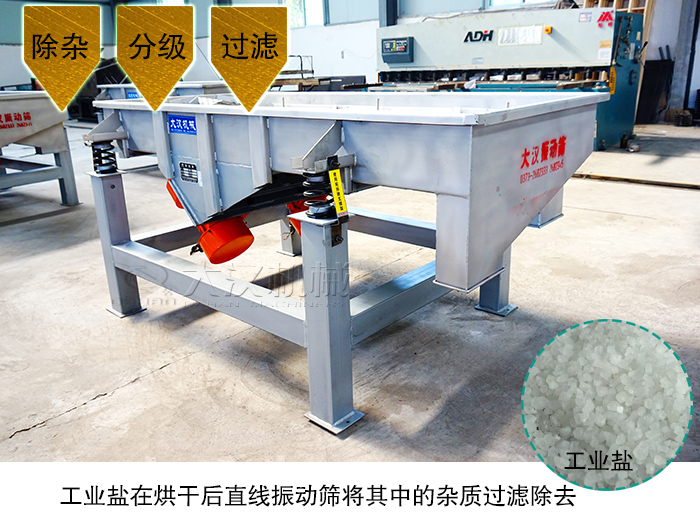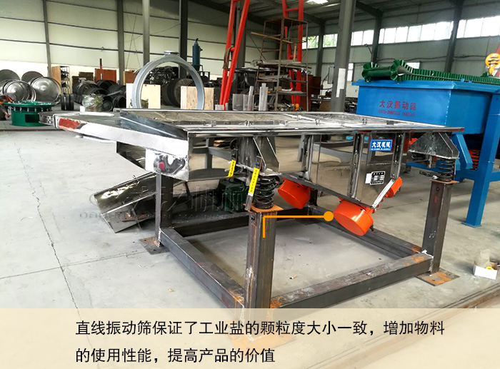 工業(yè)鹽在生產(chǎn)包裝發(fā)貨前可能會混有雜質(zhì),所以需要使用振動篩先將其篩分過濾掉,才能進(jìn)入下一步的包裝機(jī)中,在工業(yè)鹽生產(chǎn)線上通常需要有兩道振動篩來對物料的品質(zhì)進(jìn)行把控,所以大漢根據(jù)多年篩選經(jīng)驗(yàn)推薦您使用直線振動篩來篩分工業(yè)鹽。