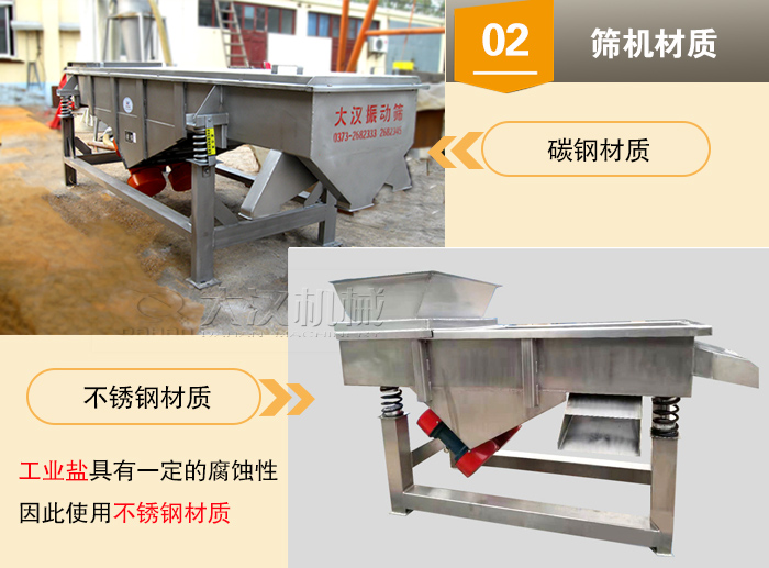 【篩機(jī)材質(zhì)】——常用的直線振動篩有不銹鋼和碳鋼兩種材質(zhì),因?yàn)楣I(yè)鹽具有一定的腐蝕性,因此使用不銹鋼材質(zhì),使用時間更長,對物料也具有保護(hù)作用。