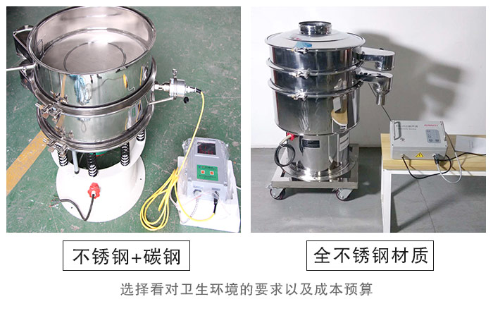【篩機(jī)材質(zhì)】—— 玉米淀粉作用食品行業(yè)物料,所以推薦您使用不銹鋼材質(zhì),而常用的不銹鋼超聲波振動(dòng)篩分為兩種結(jié)構(gòu),一種是整機(jī)均采用不銹鋼制成,另一種是與物料接觸不分為不銹鋼材質(zhì),底座為碳鋼材質(zhì),至于如何選擇就看您對(duì)衛(wèi)生環(huán)境的要求以及成本預(yù)算了。