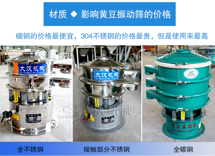 影響黃豆振動(dòng)篩價(jià)格的因素有多種(如:材質(zhì)、型號(hào)、層數(shù)、設(shè)計(jì)、廠家等),那么今天就以材質(zhì)為例,為您說說黃豆振動(dòng)篩的價(jià)格情況!