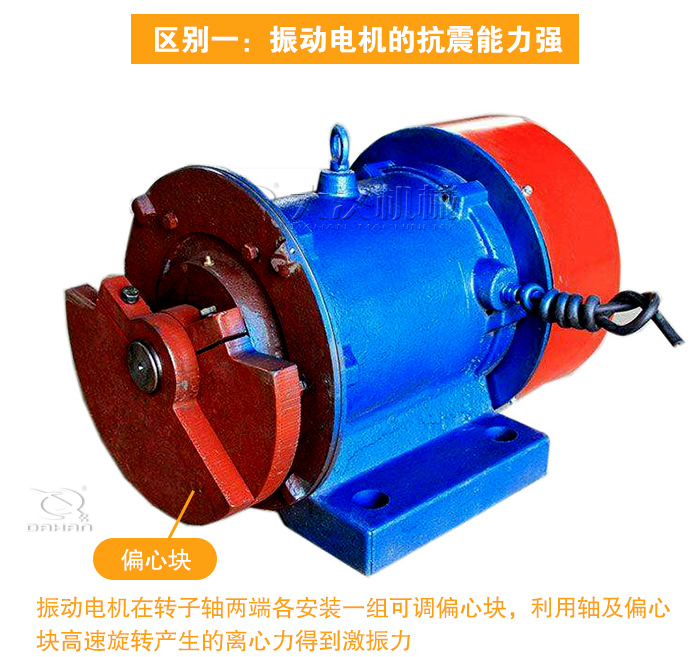 振動電機和普通電機的內部結構相同。主要區(qū)別是振動電機在轉子軸兩端各安裝一組可調偏心塊,利用軸及偏心塊高速旋轉產生的離心力得到激振力。振動電機比普通電機的機械和電氣方面都要求有可靠的抗震能力。同樣功率等級的振動電機的轉子軸要比同級別普通電機的軸粗得多。