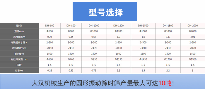 大漢機械生產(chǎn)的圓形振動篩時篩產(chǎn)量可達10噸!型號有:DH-400mm、DH-600mm、DH-800mm、DH-1000mm、DH-1200mm、DH-1500mm、DH-1800mm、DH-2000mm等八種標準型號??蓾M足肥料每小時500KG—10T的大、中、小產(chǎn)量的篩分工作。