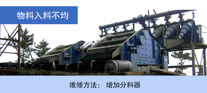 進(jìn)入圓振篩的下料漏斗,是一個人字型的漏斗,而入料皮帶時(shí)常跑偏和漏斗積泥等原因,導(dǎo)致分料不均,從而致使一邊篩網(wǎng)嚴(yán)重過載,而另一邊篩網(wǎng)近乎空載運(yùn)行,所以常造成篩網(wǎng)磨損不均破損較快。