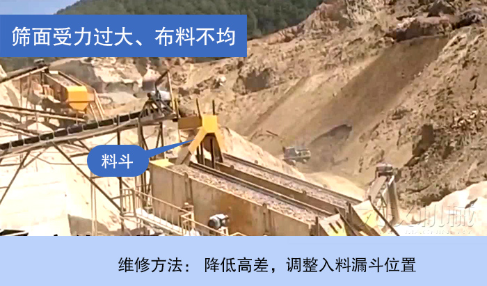 漏斗和圓振篩入料端距離太高,礦石從漏斗進(jìn)入圓振篩時(shí),對入料處沖擊力過大,導(dǎo)致入料處大梁斷裂、箱體開裂等問題;礦石進(jìn)入圓振篩入料端后,分布不均勻,礦石總是往一側(cè)跑,只有一半的篩網(wǎng)起到篩分作用,導(dǎo)致一邊積礦嚴(yán)重,篩分效率低。