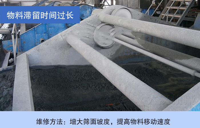礦石在篩網(wǎng)上移動慢,礦石移動速度過慢,導(dǎo)致篩面上積礦過多,使圓振篩總是在超負(fù)荷的狀態(tài)下運(yùn)行,從而導(dǎo)致篩網(wǎng)破損快,撓性聯(lián)軸器撕裂、彈簧損壞、大梁斷裂、箱體開裂等一系列故障。