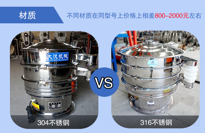 皂粉旋振篩材質(zhì)上可分為304不銹鋼與316不銹鋼,不同材質(zhì)在同型號上價格上相差800-2000元左右。皂粉旋振篩在結(jié)構(gòu)材質(zhì)上可分為全不銹鋼材質(zhì)(整機(jī)不銹鋼材質(zhì))和不銹鋼+碳鋼材質(zhì)(與物料部位為不銹鋼材質(zhì),底座為碳鋼材質(zhì))兩種??筛鶕?jù)不同的篩分使用環(huán)境來選擇不同的結(jié)構(gòu)材質(zhì)。