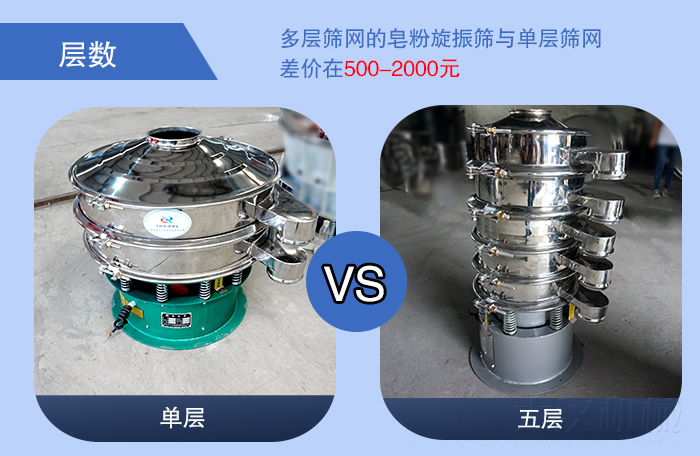 皂粉旋振篩可安裝1-5層篩網(wǎng),同時進(jìn)行2~6個等級的皂粉篩分、過濾、分級、除雜,可根據(jù)不同的篩分需求安裝不同層數(shù)的篩網(wǎng),安裝多層篩網(wǎng)的皂粉旋振篩肯定會比單層篩網(wǎng)的要貴一些,他們的差價在500-2000元左右。具體的層數(shù)選擇就是要根據(jù)您的篩分目的來決定。