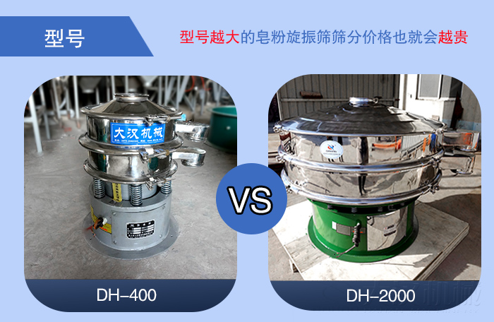 皂粉旋振篩的型號可分為DH-400、DH-600、DH-800、DH-1000、DH-1200、DH-1500、DH-1800、DH-2000等八種標(biāo)準(zhǔn)型號,型號差異主要是根據(jù)篩機(jī)直徑?jīng)Q定,直徑越大型號越大,隨之每小時篩分的皂粉產(chǎn)量就越大,型號越大的皂粉旋振篩篩分價格也就會越貴。