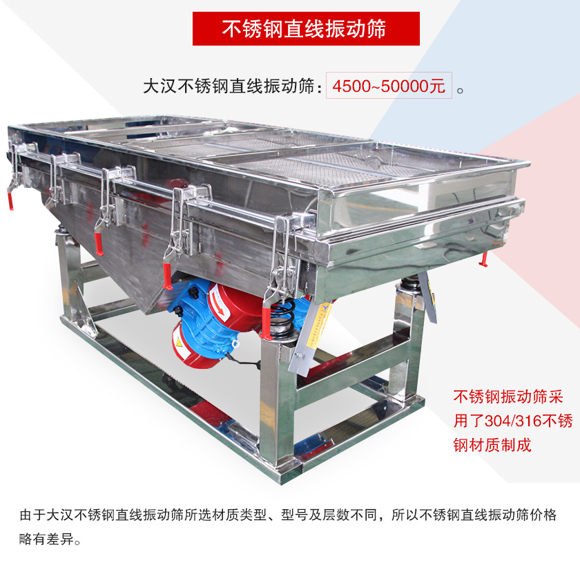 由于大漢不銹鋼直線振動(dòng)篩所選材質(zhì)類型、型號(hào)及層數(shù)不同,所以不銹鋼直線振動(dòng)篩價(jià)格略有差異。以下即是相關(guān)介紹。